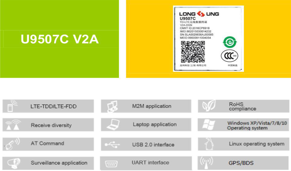 U9507C V2A 是豪门国际科技推出的一款 LTE Cat4 无线通信模块,内置丰富的网络协议,集成多个标准接口。 可以工作在 LTE-TDD/LTE-FDD/TD-SCDMA/UMTS/EVDO/EDGE/GPRS/CDMA/GSM 等多种制式。